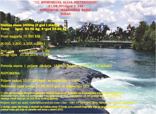 Teret: muška grla 60 kg ženska grla 58 kg konji sa 3 godine imaju popust od 1 kg; konji stariji od 3 godine sa pobjedom u 2014 nose 1 kg više; kastrati nose 59 kg. Nagradni fond: 1. 1,500KM 2. 1,000KM 3. 500,00KM