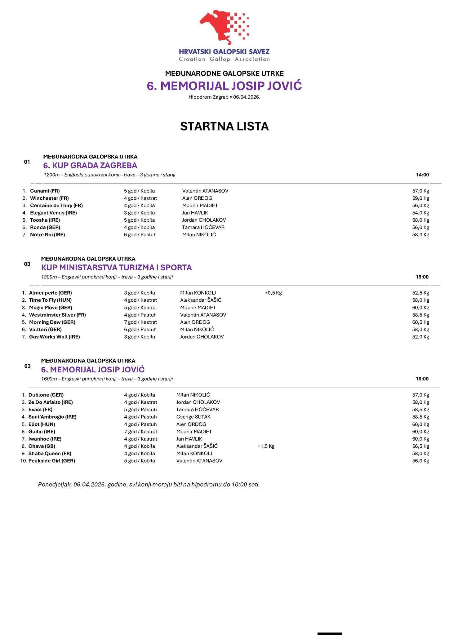 Prvi trkački dan u Zagrebu je pod visokim pokroviteljstvom Predsednika RH. Ujedno, otvaranjesezone 2026 u Zagrebu je i provera nove travnate staze zagrebačkog hipodroma pred Trial Stakes koji će se održati 29.06. Planirana su ukupno četiri trkačka dana u mesecima april, jun, avgust i oktobar.
